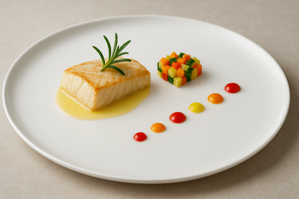 Hafif ızgara edilmiş levrek filetosu, yanında birkaç damla limon-zeytinyağı emülsiyonu ve üç renkli sebze küpleri.